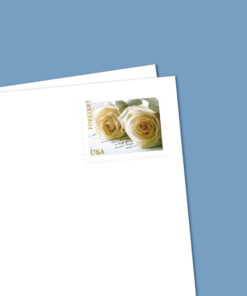 The Wedding Roses stamp. created by designer Ethel Kessler from Bethesda. Maryland. showcases a captivating photograph taken by Renee Comet of Washington. DC. The image beautifully captures two white roses delicately placed on a piece of wedding correspondence. with a subtle white ribbon appearing in the background. This elegant stamp adds a touch of grace and sentiment to wedding invitations and RSVP envelopes. symbolizing the beauty and significance of the occasion.