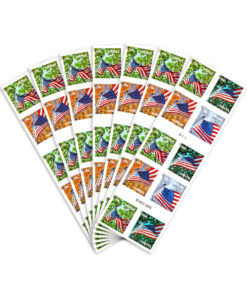 Laura Stutzman of Maryland created the patriotic gouache illustrations from her own photographs for the Flag for All Seasons stamps.? Each of the four stamps in the issue pictures the U.S. flag. as seen from below. with the trees and sky representing the season.?