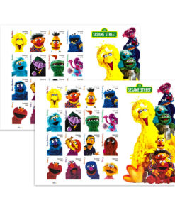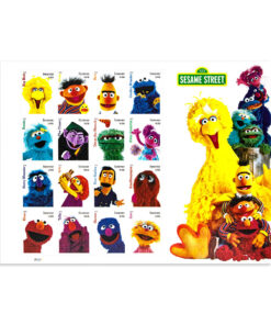 The stamp art features photographs of Muppets Big Bird. Ernie. Bert. Cookie Monster. Rosita. The Count. Oscar the Grouch. Abby Cadabby. Herry Monster. Julia. Guy Smiley. Snuffleupagus. Elmo. Telly. Grover and Zoe. Art Director Derry Noyes designed the stamps.?