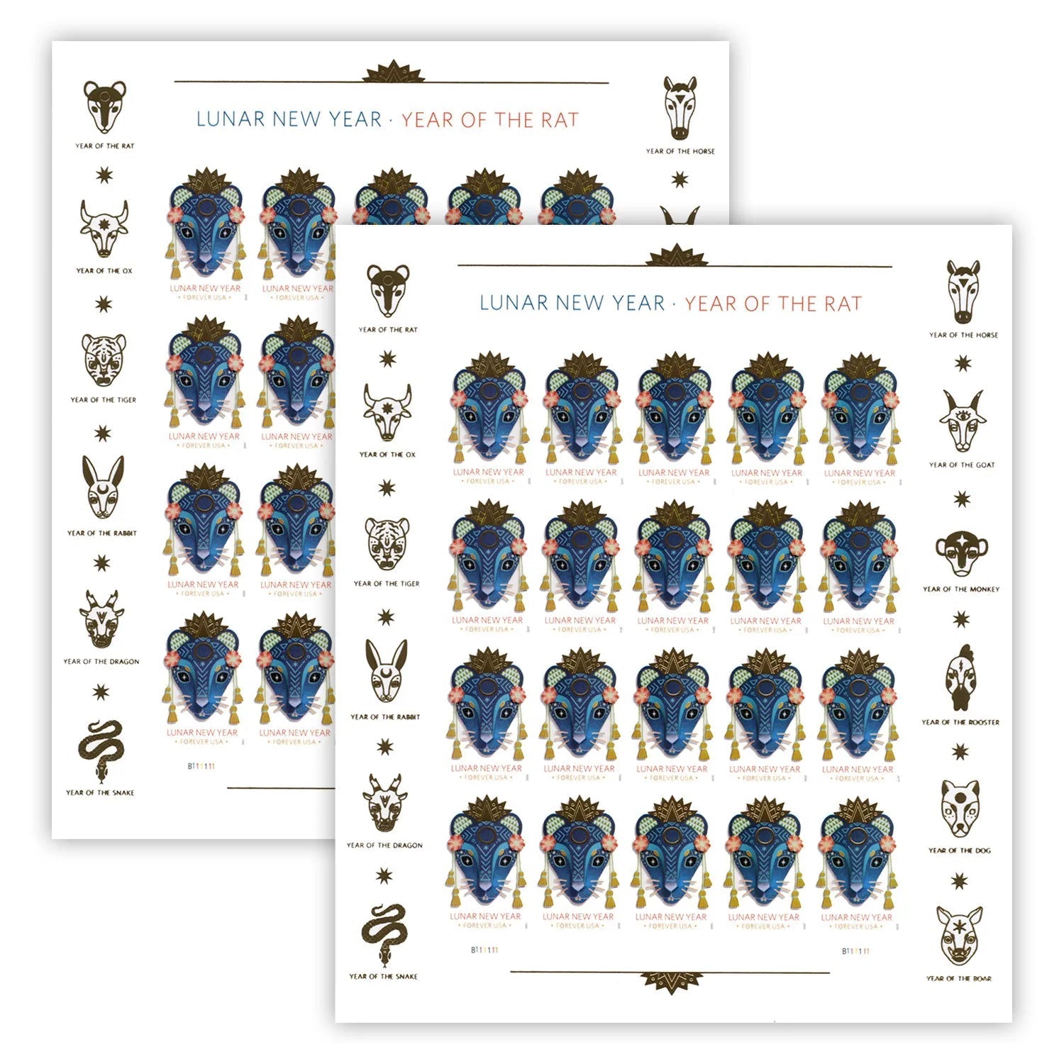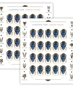 With blue as the predominant color a said to be one of the lucky colors for individuals born during the Year of the Rat a the rat mask in the stamp design incorporates elements with symbolic meaning. Several of the patterns were created with the style of Asian textiles and the circle in the center of the rat head represents the new moon on which the Lunar New Year begins. A pop of the very lucky color red ties the design in with other common celebratory decorations.