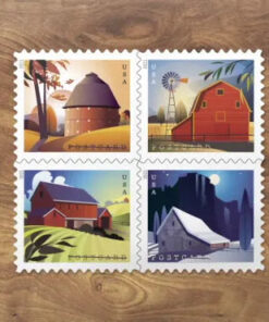 The U.S. Postal Service issues four new postcard stamps that celebrate the beauty and history of American barns. Each piece reflects one of the four seasons: a round barn .surrounded by the hazy light and warm colorsof fall; a gambrel-roofed barn in summer; a forebay barn in an early spring countryside; and a Western barn on a winter’s night.