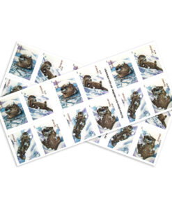 Otters in Snow. a booklet of 20 stamps featuring four scenes of the alert and playful North American river otter reveling in a winter landscape.