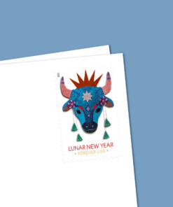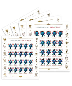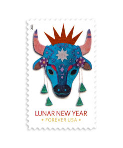 The Year of the Ox stamp is the second stamp issued in the latest Lunar New Year stamp series designed by artist Kam Mak. who was born in Hong Kong and grew up in New York City’s Chinatown after his family moved to the U.S. in 1971. Art director Ethel Kessler of Bethesda. MD. worked on the new series with Mak. who now lives in Brooklyn. NY. They focused on some of the common ways the Lunar New Year Holiday is celebrated. To commemorate the Year of the Ox (Jan. 26. 2009 – Feb. 13. 2010). they chose a lion head of a type often worn at parades and other festivities.