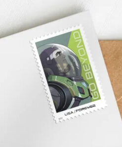 Go Beyond is a pane of 20 stamps arranged in four horizontal rows of five stamps featuring the image of Buzz Lightyear. The selvage features the full-body image of Buzz Lightyear against a graphic background and the slogan “From Infinity to Forever.” with the word “Lightyear” enhanced by a spaceship streaking through the letters. Each row features the same designs in differing orders. On each row. the first design repeats as the last stamp. All of the designs feature modern. angular. geometric backgrounds in various greens and grayish blue-greens. accentuating the familiar colors of Buzz’s spacesuit along with the phrase “GO BEYOND.”