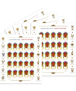 Art director Antonio Alcal?????? worked on the series of stamps with artist Camille Chew to create Lunar New Year imagery that is fresh. fun and celebratory. Calling to mind the elaborately decorated masks used in the dragon or lion dances often performed during Lunar New Year parades. Chew????s three-dimensional masks are a contemporary take on the long tradition of paper-cut folk art crafts created during this auspicious time of year.