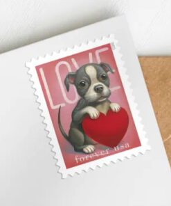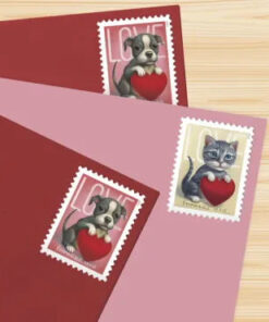 The stamps???? two designs feature either a kitten or a puppy with the word ???LOVE???? along the top. partially obscured by the heads of the animals. The words ???forever???? and ???usa???? in lowercase letters run along the bottom. Art director Ethel Kessler designed the stamps with original art by Chris Buzelli.