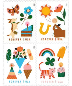 The pane of 20 stamps features five unique designs filled with a variety of whimsical images. including flowers. balloons. cute animals. sweet treats and symbols of good luck. Capturing the excitement and delight of receiving a card in the mail meant just for you. each digital illustration uses a cohesive color palette to bring together the disparate icons in the designs. Words of encouragement and thoughtful affirmations surround the stamps on the pane in the same tones. Each greeting is die-cut and self-adhesive.