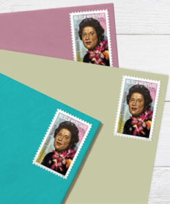 The stamp features a portrait of Motley by artist Charly Palmer. based on an Associated Press photograph. Rendered in acrylic on canvas work. the portrait displays elements of Palmer????s signature style. The stenciled circular shapes around the head suggest royalty. and the heavy brushstrokes and scratches provide added textures. Stenciled curlicues embellish the lower background and continue onto Motley????s black dress. Her colorful corsage and a brooch further enliven the image.