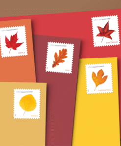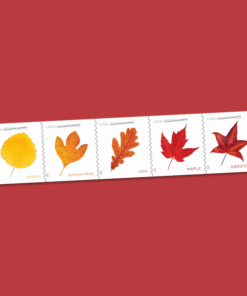 Five new postcard stamps depicting colorful leaves from trees abundant in this country evoke a seasonal walk in the woods.